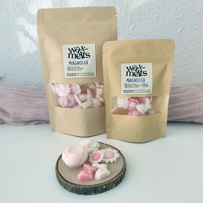 Todos nuestros wax melts están hechos a mano en nuestro taller con cera de soja pura y contienen micas minerales que crean unos preciosos brillos que bailan en la cera derretida. ¡Un gran placer para tus sentidos!