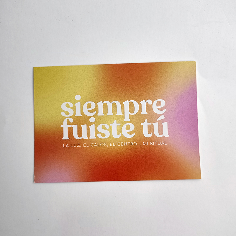 La tarjeta «Siempre fuiste tú…», está llena de sentido y significado. Su texto hace referencia a lo importante que es esa persona para nosotros, lo bueno que nos aporta y cómo se convierte para nosotros en un ritual al hacerla imprescindible en nuestra vida… ¡un ritual que nos hace mucho bien!