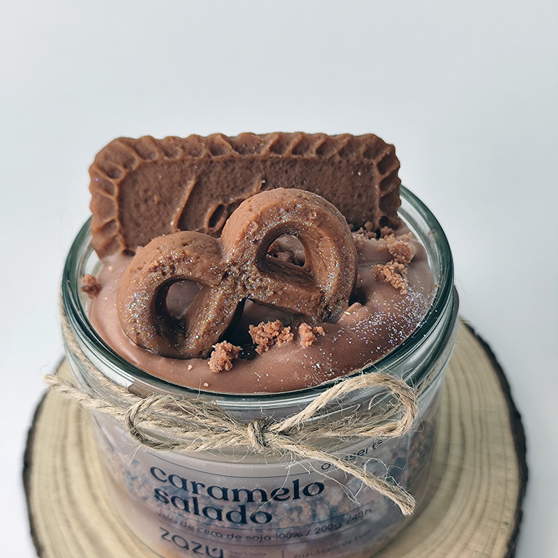 Vela postre Caramelo Salado, hecha de cera de soja 100% natural.