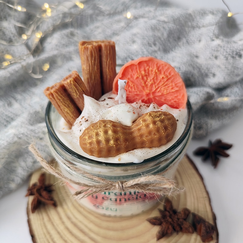 Decorada con delicadeza con ramitas de canela y rodajas de naranjas, cada vela es una pieza artesanal única perfecta para tus rituales de autocuidado o para regalar a alguien especial.